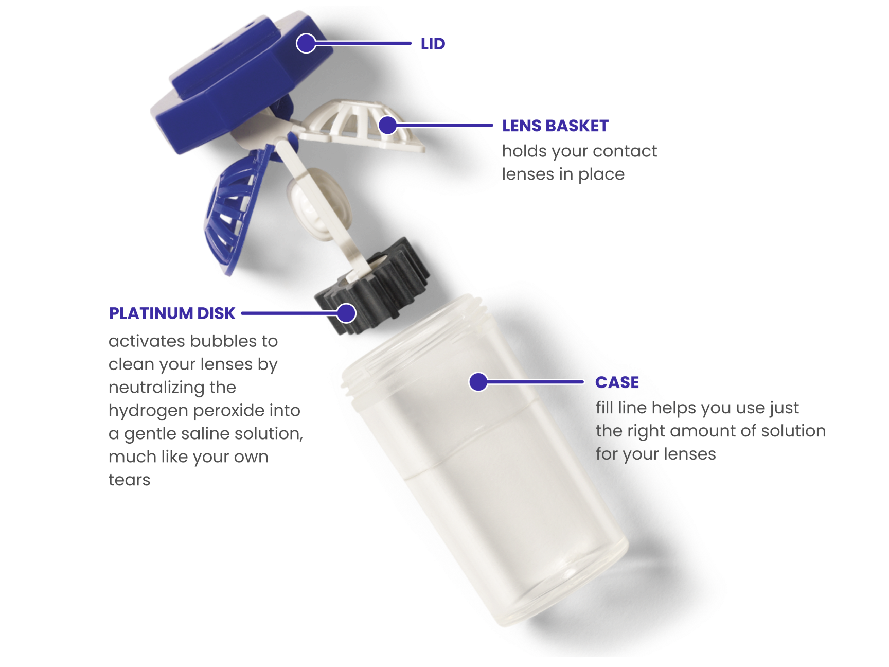 The CLEAR CARE® PLUS Cleaning & Disinfecting Solution system includes the CLEAR CARE® PLUS solution and its specially designed lens case. The lens case features a transparent cup with a screw cap, lens holders (baskets), and a neutralizer catalyst disc at the bottom, all working together to ensure effective cleaning and disinfecting. For optimal results, CLEAR CARE® PLUS solution and the accompanying lens case must always be used together, providing a thorough and reliable lens care routine.
